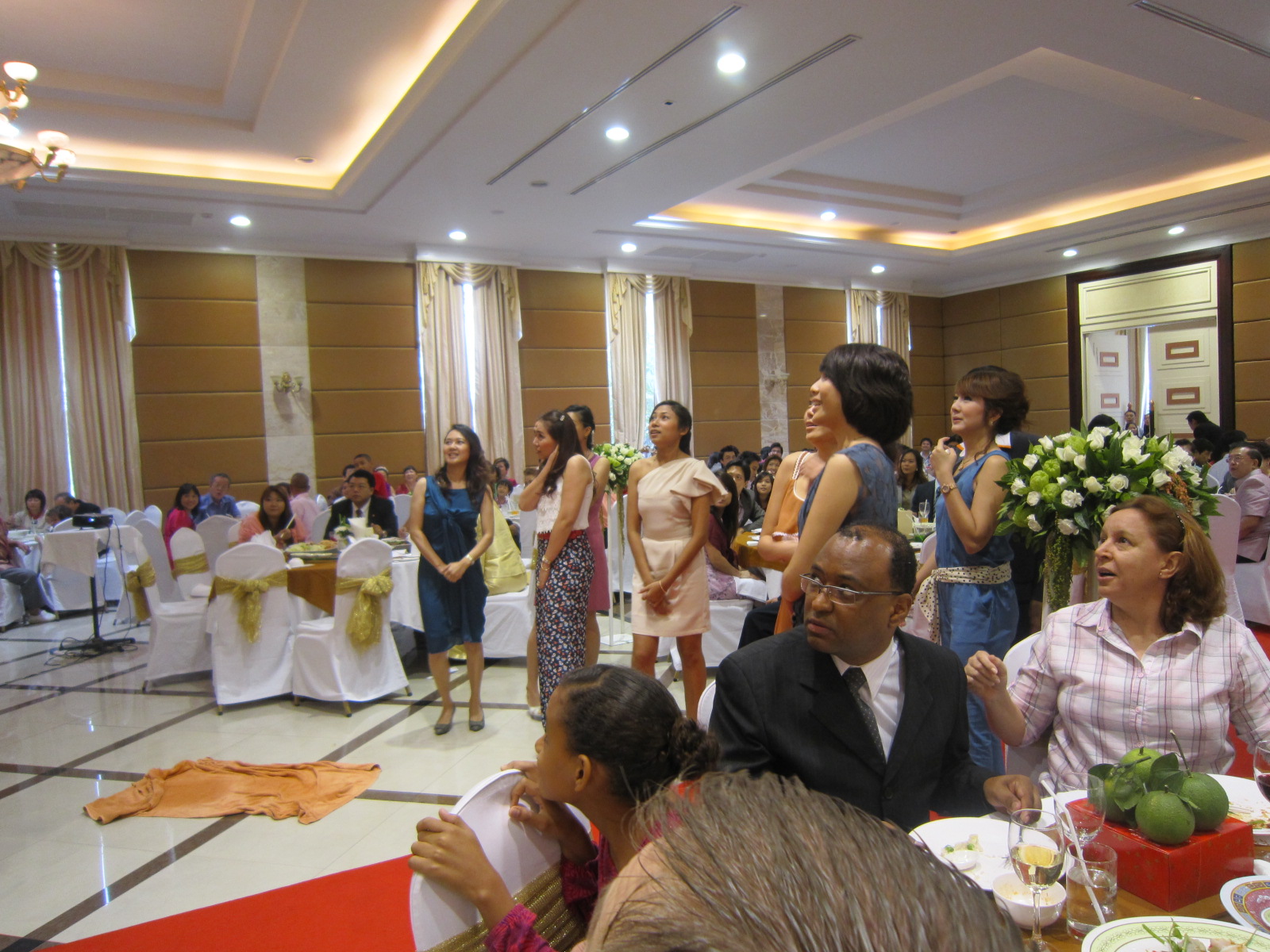 The beautiful couple served cake to guests. Rob said they shared same planning woes common back home, hoping to keep guest list small, but ballooning to 300 (to which we say, "ELOPE!"). There were many tables of work colleagues and their families. We were honored guests, seated in front next to the parents and given special Chinese mooncakes in red box as well as customary green oranges. Job is highly respected in Asia, where groom's boss typically gives the speech... he is the best man considering he signs respected paycheck. I wonder if this tradition will continue as women begin to take the helm.